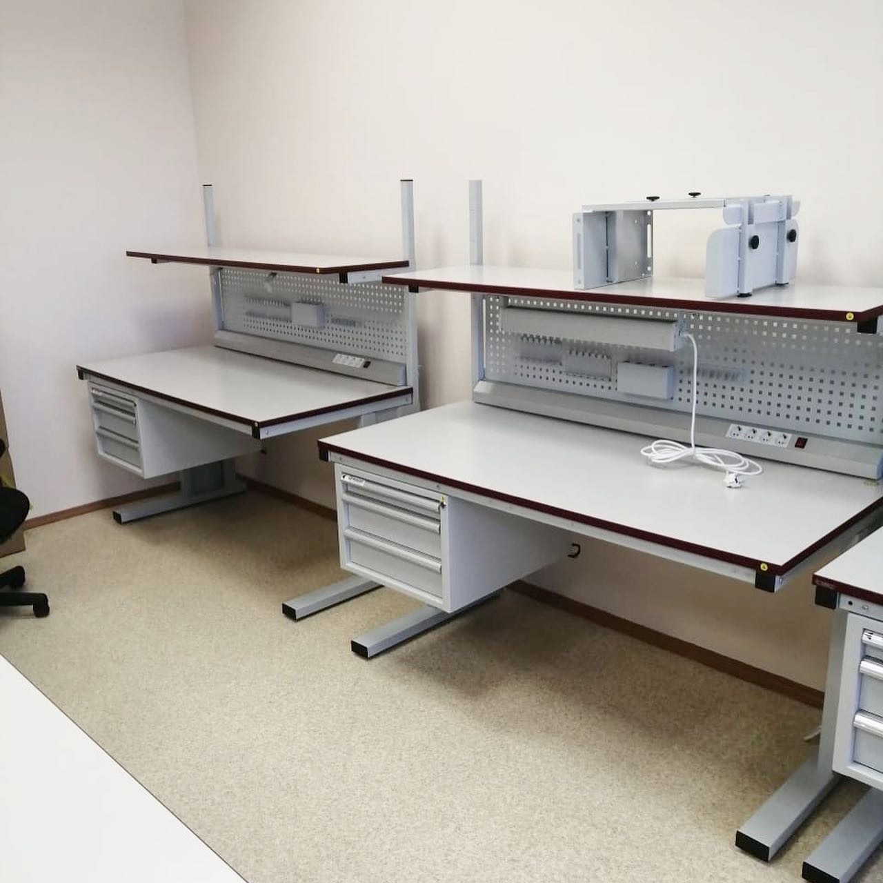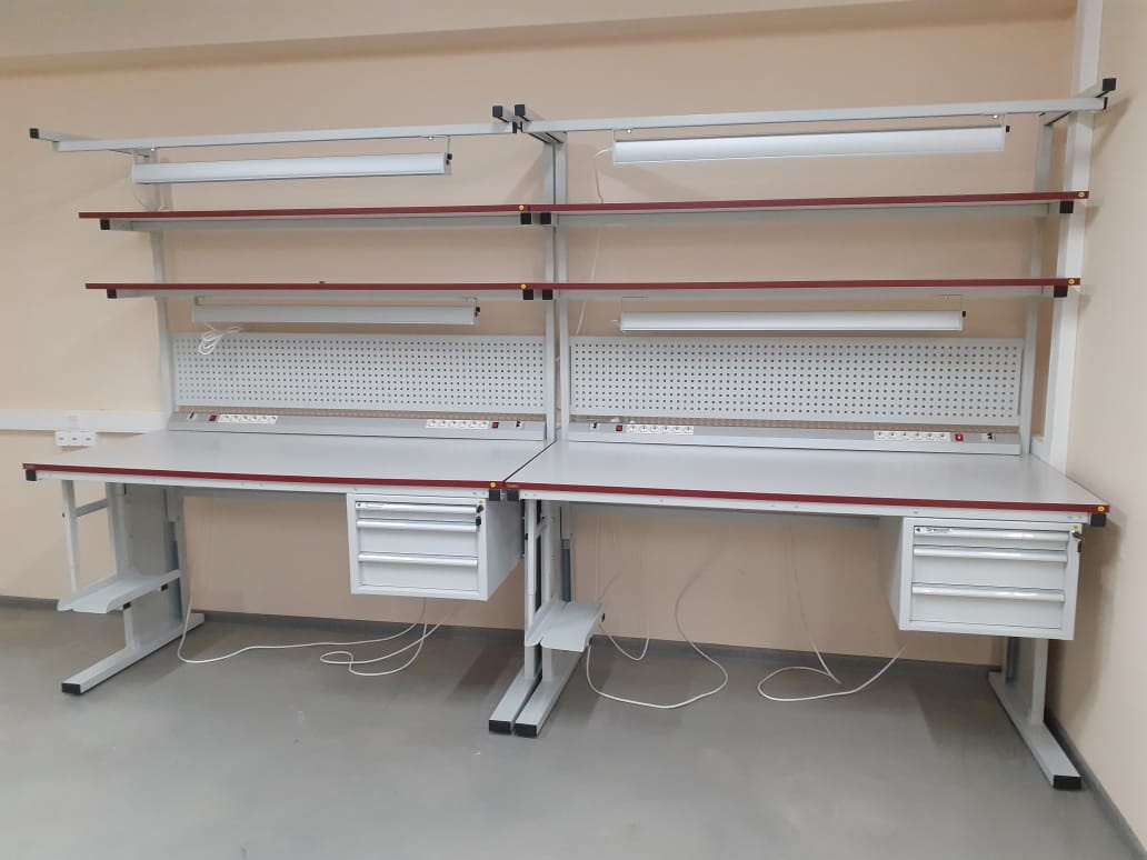 Модульная конструкция дает возможность оснастить стол дополнительным оборудованием: подвесными тумбами, перфорированными панелями, электропанелями, планкой для крепления лотков, полками для приборов оборудования, полкой приборной нижней, освещением рабочей поверхности, угловым столом, крючками для инструментов и другим дополнительным оборудованием и оснащением.