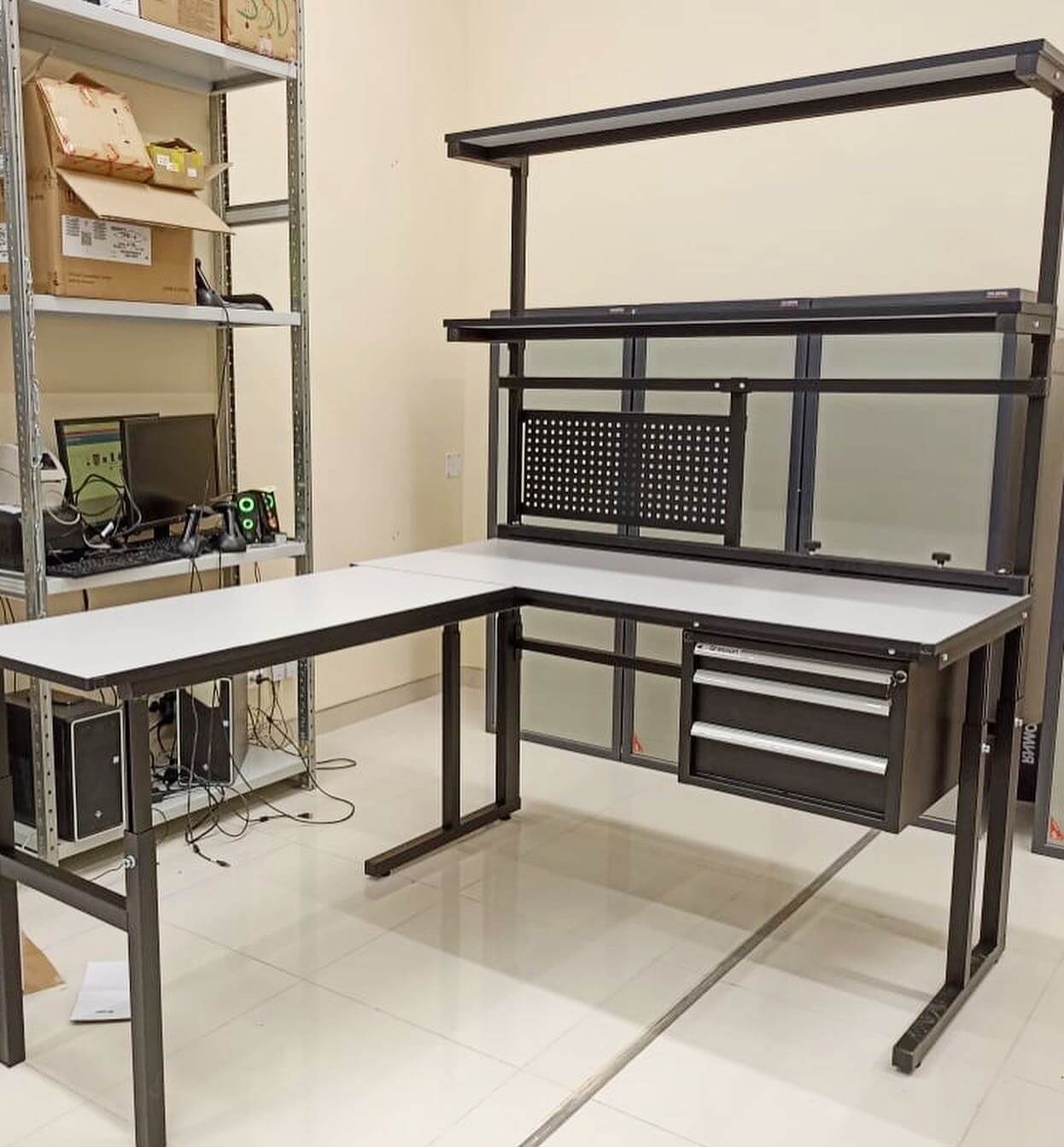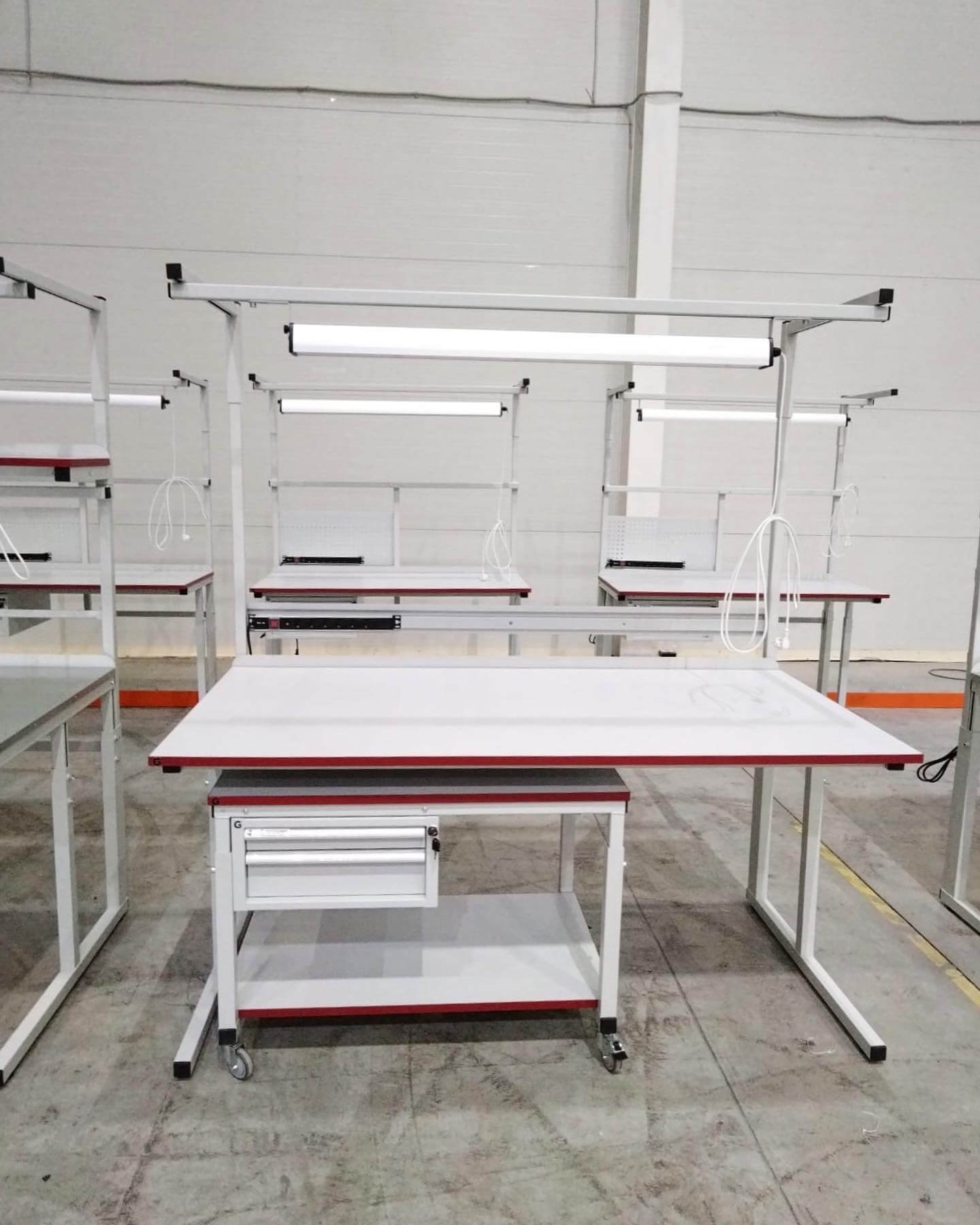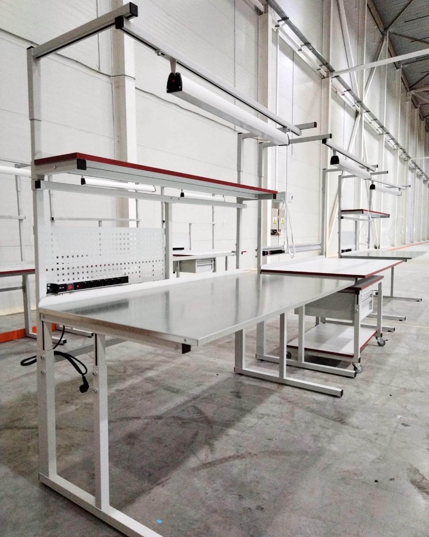 Модульная конструкция дает возможность оснастить стол дополнительным оборудованием: подвесными тумбами, перфорированными панелями, электропанелями, планкой для крепления лотков, полками для приборов оборудования, полкой приборной нижней, освещением рабочей поверхности, угловым столом, крючками для инструментов и другим дополнительным оборудованием и оснащением.