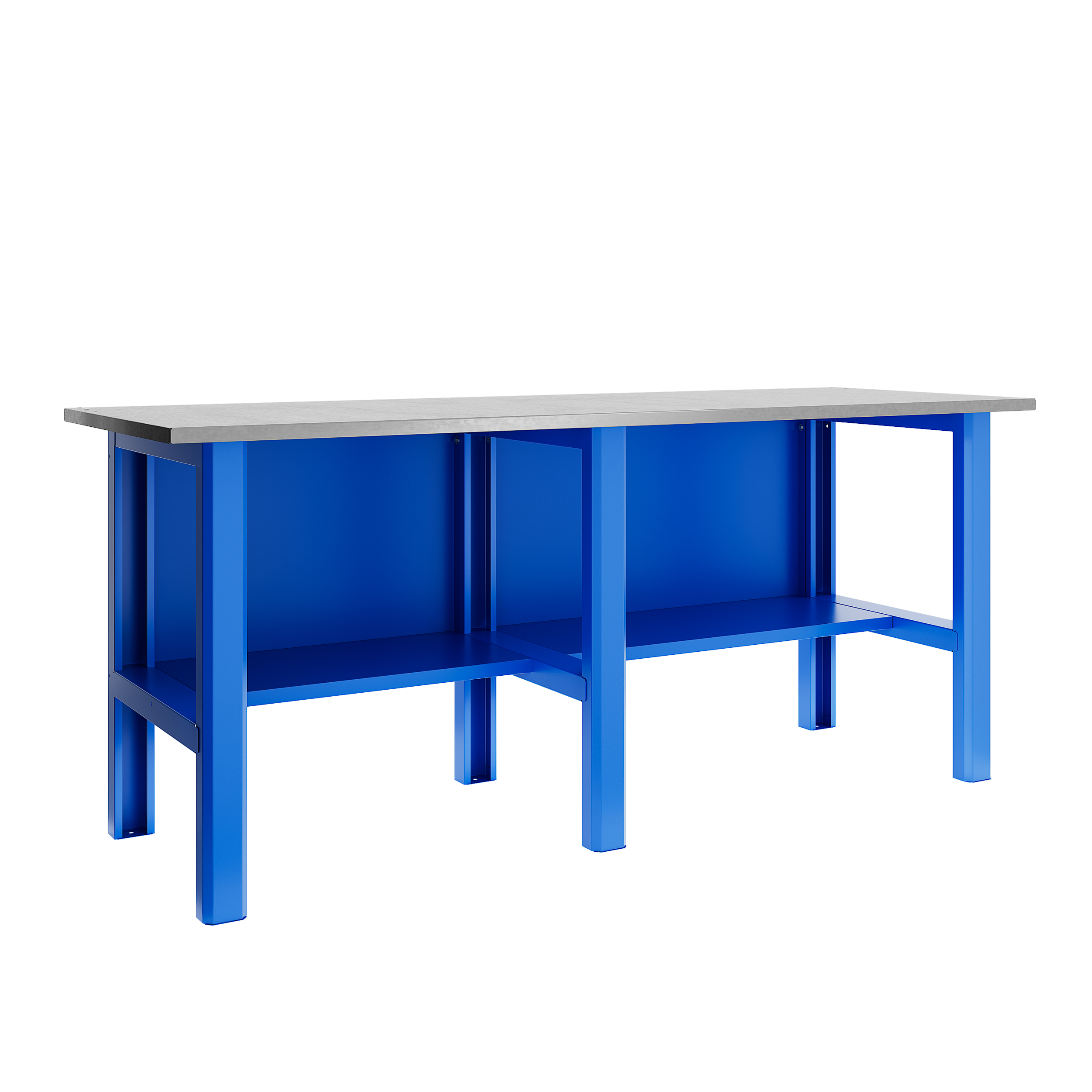 Верстак TNC 201.111.23 состоит из столешницы шириной 2000 мм, трёх опор и двух полок-стенок.