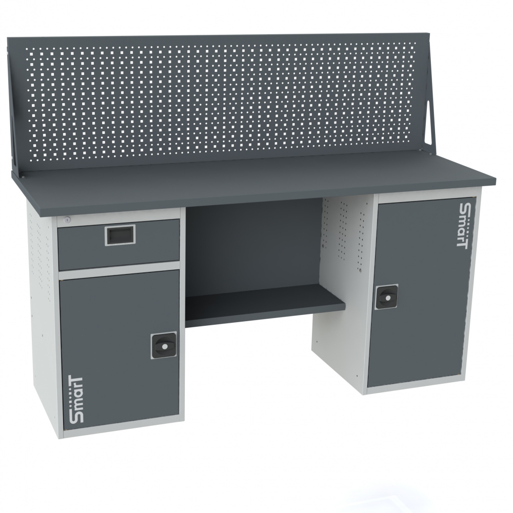 Универсальный металлический верстак серии Smart предназначен для обустройства легких производств, мастерских и гаражей. Все элементы изготовлены из высококачественной листовой стали, а покрытие устойчиво к механическим воздействиям и агрессивным жидкостям.
