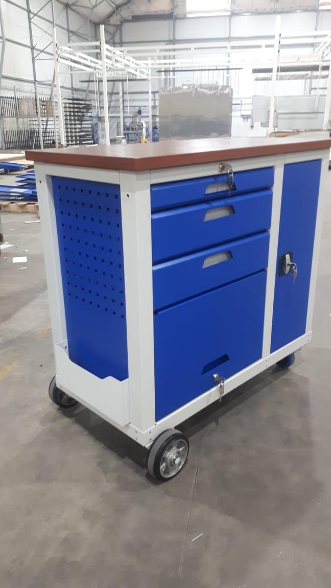 - Колеса: 2 поворотных d=100 мм, одно из них со станочным тормозом. и два неповоротных колеса d=160 мм, выступающих за плоскость тумбы, обеспечивают высокую устойчивость
