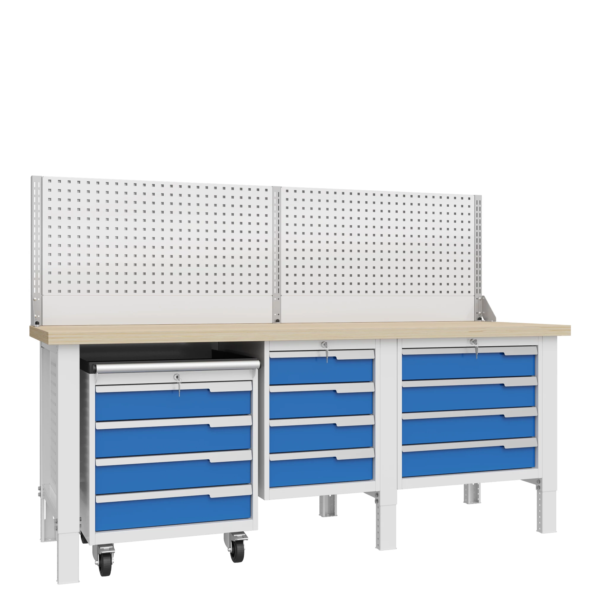 Регулировка рабочего места по высоте осуществляется в диапазоне от 700 до 950мм с шагом 25мм. Предусмотрена возможность тонкой регулировки усиленным резьбовым подпятником. Нагрузка на ящики верстака - до 40 кг, на полки - до 60кг. Общая распределенная нагрузка на рабочую поверхность 1500кг. Имеет возможность стыковки в единую рабочую поверхность с верстаками серии Constructor
