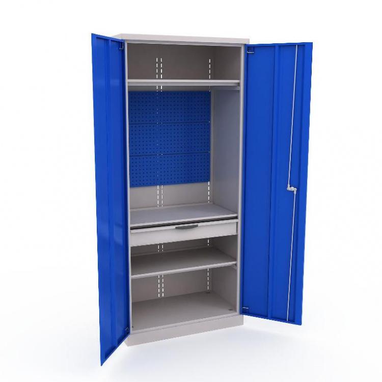Цена 47500 руб. — выгодное вложение в долговечную систему хранения. Можно купить шкаф с доставкой по России. Заказать модель в базовой комплектации (с полками, ящиком и перфорированными стенками) или с дополнительными аксессуарами (крючки, планшеты, лотки). Окраска порошковой краской устойчива к царапинам. При необходимости доступна покраска в другой цвет под заказ.