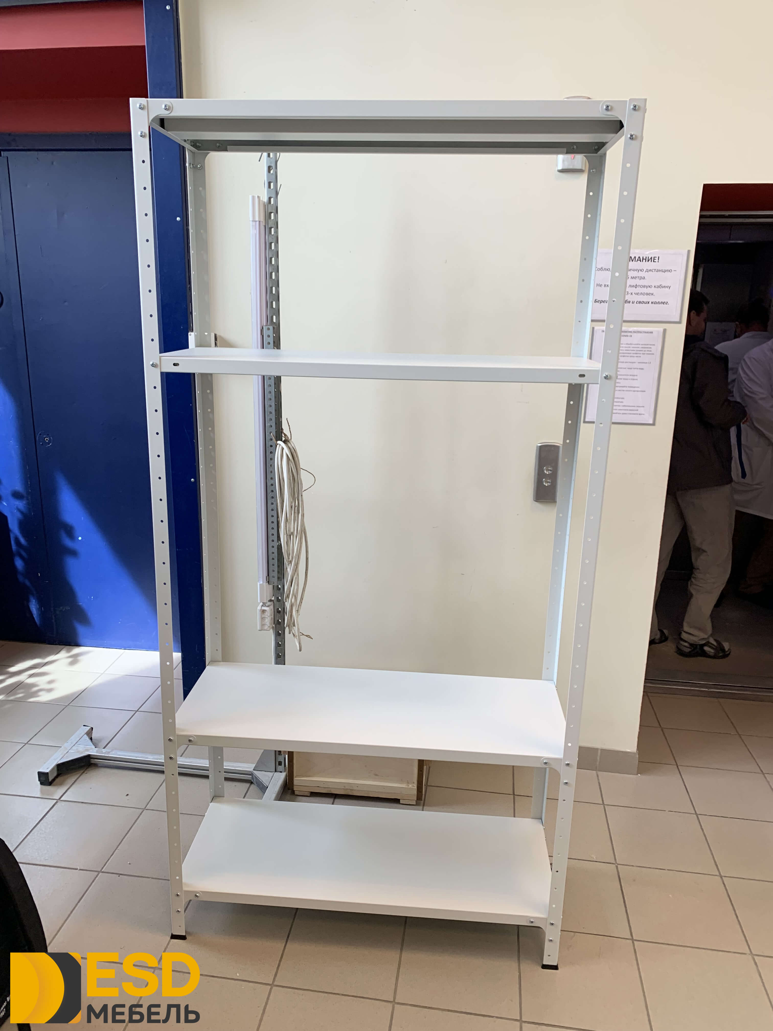 Полки стеллажа изготовлены из листового металла с ребром жесткости и выдерживают равномерно распределенную нагрузку до 100 кг. Стеллаж окрашен износостойкой и влагостойкой порошковой краской светло-серого цвета RAL-7035.