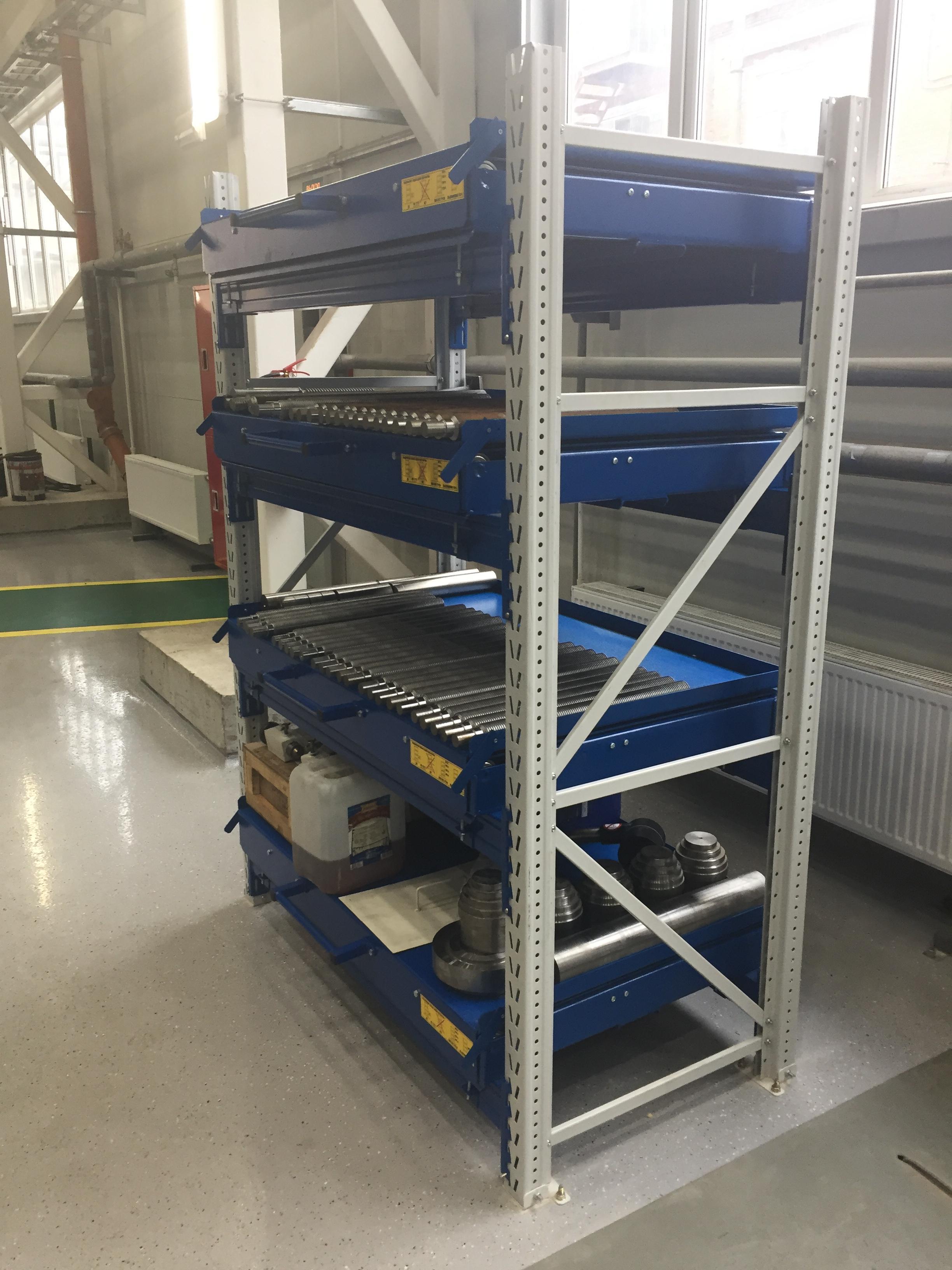 - Выкатные платформы на шарикоподшипниковых направляющих, закрепленных на балках стеллажа при помощи стяжных кронштейнов (4 шт/платформу), с ручкой и фиксатором (блокировка выкатывания)
