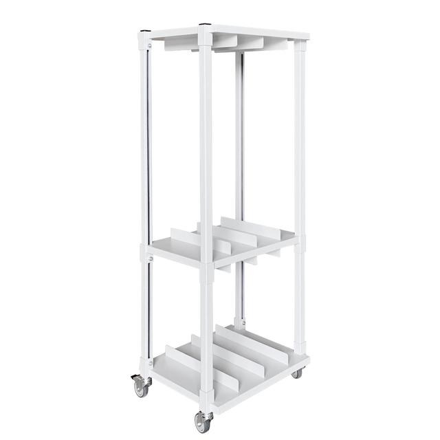 Передвижная стойка СКК используется для хранения и перемещения картонных заготовок, коробов. Полки имеют плавную, индивидуальную регулировку высоты и оборудованы перегородками для фиксации и разделения изделий. Верхняя полка имеет полость с резиновым покрытием для размещения вспомогательных, измерительных, канцелярских и иных принадлежностей. Внутреннее расстояние между нижней и верхней полками составляет 1340 мм. Стойка имеет четыре поворотных колеса (Ø 75 мм), два из которых оснащены тормозами. Каркас и полки выполнены из стали с эпоксидно-порошковым покрытием (Опционально RAL 7035). Макс. нагрузка на стойку - 150 кг. Стойку для картонных коробок можно разместить рядом с рабочим столом, на складе или в зоне комплектации и упаковки.