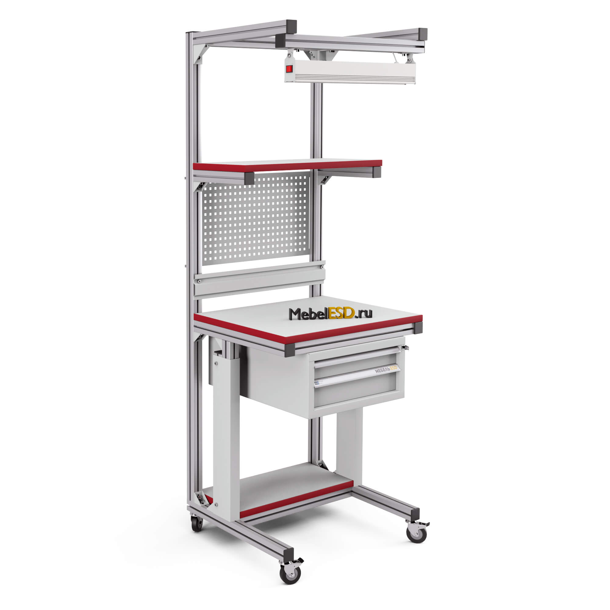 Конструкция стойки позволяет оснастить ее дополнительными оборудованием: полкой полкой с упором от скатывания, лотками промышленными и антистатическими, электропанелью, кронштейнами для монитора КМ-1 и КМ-2, клипсами держателями для кабеля, инструментальной планкой с карабином, держателями для инструмента.