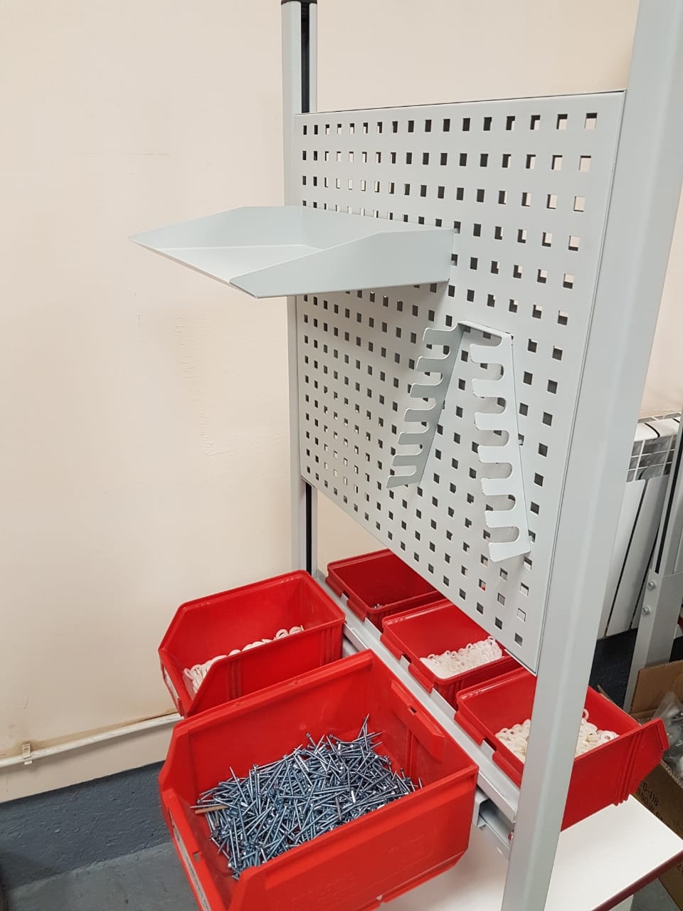 Стойка подкатная универсальная СПУ используется для хранения и перемещения инструментов, материалов и комплектующих в рабочем пространстве. В стандартной комплектации стойка поставляется в комплекте с полкой для оборудования ПОС, панелью перфорированной ППМ и планкой для лотков ПЛМ (2 шт.). Возможно зеркальное (двухстороннее) размещение планок для лотков и перфопанелей. Регулировка высоты дополнительного оборудования осуществляется по боковым стойкам. Конструкция стойки позволяет оснастить ее дополнительным оборудованием — полками, перфопанелями и планками для лотков. Стойка мобильная имеет металлический каркас, окрашенный порошковой краской.